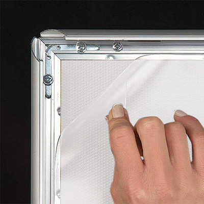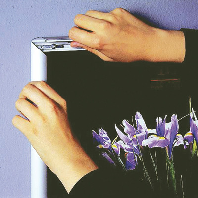 Silbereloxierten Alurahmen mit Ecken auf Gehrung. PS Rückwand in weiß und entspiegelter APET Frontscheibe. Komplett mit Schrauben und Dübeln geliefert.